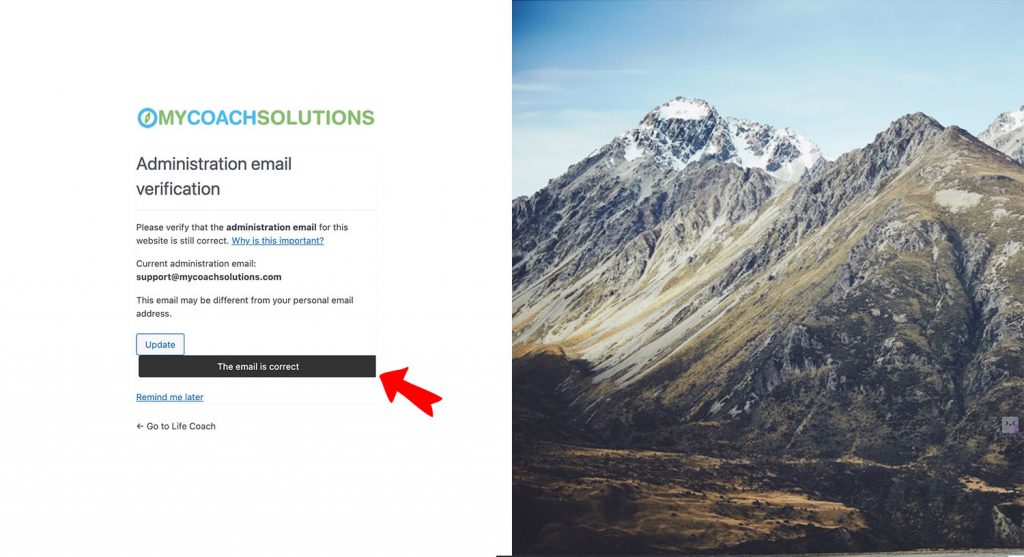 You might (or might not) see the following screen prompting you to verify the administration email address. It SHOULD say support@mycoachsolutions.com. Please do not change it. Instead, just click the button that says “The email is correct”.