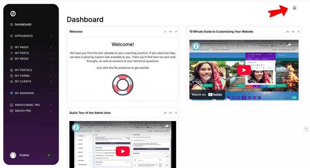 You’re now in your website’s admin area. From here, you can access the support website by clicking on the life preserver. There are also a couple of video tutorials here that will show you how to update your website.