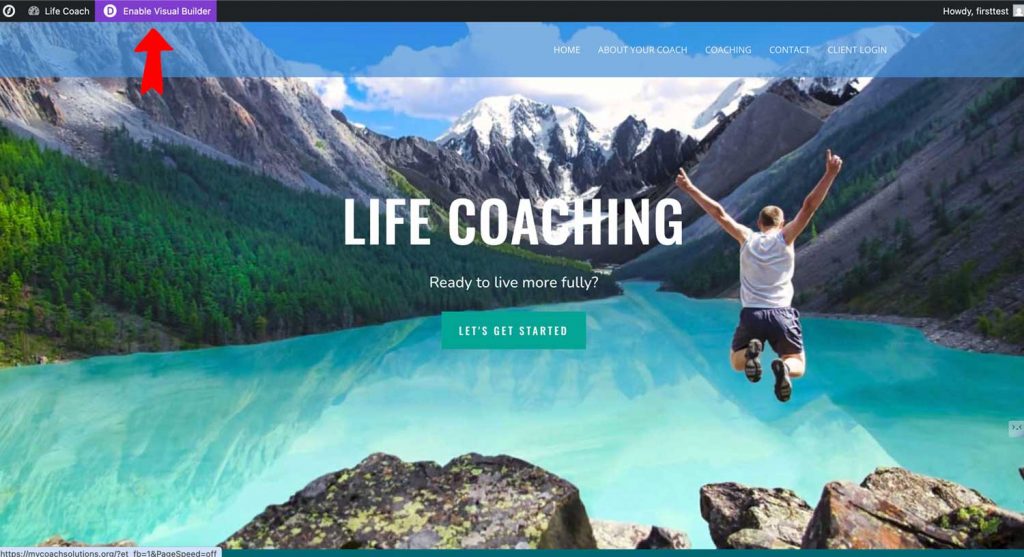 To go to the public facing part of your website and access the visual builder to make changes, click on the house icon or the link that says “visit site”.