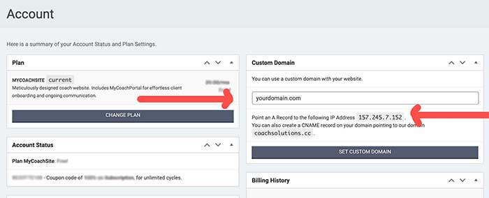 One last thing. Working with domains can be complicated. If you’re okay simply forwarding your domain (typing your domain in the address bar to get to your website, but having your coachsolutions.cc URL displayed when you get there) most domain registrars have a simple procedure for doing that. Check your registrar’s help files.